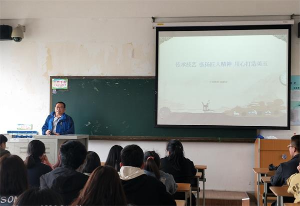 首期“技藝工坊”,我們邀請了中國玉雕工匠、東北工藝美術聯(lián)盟雕刻藝術委員會副主任、遼寧省工藝美術大師——常德金。作為技藝傳承大師,常老師深情地為同學們講述了他從事玉雕行業(yè)三十多年來與玉結下的不解之緣,他用一幅幅照片為同學們展示他精美絕倫的玉雕作品。山水、人物、動物,常老師的作品題材豐富、線條流動、極富創(chuàng)意。同學們看后紛紛贊嘆,現(xiàn)場掌聲不斷?;迎h(huán)節(jié),常老師邀請同學們來到臺前,親身體驗玉雕的制作過程。熱情的同學們把展臺圍得水泄不通,常老師給操作的同學做了耐心細致的講解指導。通過幾位珠寶學院玉雕愛好者的共同協(xié)作,在本次活動接近尾聲的時候,一塊玉雕作品已經(jīng)初具規(guī)模。