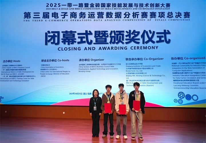 10月31日,第3屆“2025一帶一路暨金磚國家技能發(fā)展與技術(shù)創(chuàng)新大賽”電子商務運營數(shù)據(jù)分析賽項全國總決賽在浙江經(jīng)貿(mào)職業(yè)技術(shù)學院閉幕。學生譚凱瓏、董紫皓、許文滔組成的參賽團隊,在教師任曉晶、欒雅春的指導下獲“電子商務運營數(shù)據(jù)分析”賽項全國一等獎。