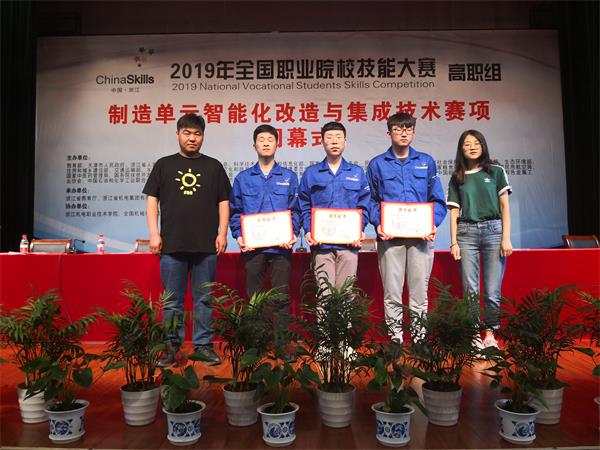 在5月31日—6月1日進(jìn)行的2019年全國(guó)職業(yè)院校技能大賽(高職組)“制造單元智能化改造與集成技術(shù)”賽項(xiàng)中由自控系郭海林、張穎老師指導(dǎo)張瑞天、鄂澤宇、黃金雷三名學(xué)生組成的代表隊(duì)榮獲二等獎(jiǎng)。本賽項(xiàng)由教育部主辦,浙江省教育廳承辦,浙江機(jī)電職業(yè)技術(shù)學(xué)院協(xié)辦,共有來自全國(guó)73支代表隊(duì)參加。此賽項(xiàng)分別從制造單元改造方案、硬件搭建及電氣接線、制造單元的集成改造、控制網(wǎng)絡(luò)的集成調(diào)試、云服務(wù)的集成調(diào)試等內(nèi)容進(jìn)行考核。競(jìng)賽以智能制造單元的系統(tǒng)集成與應(yīng)用為核心,將工業(yè)機(jī)器人、數(shù)控機(jī)床、立體倉(cāng)庫(kù)、智能傳感等作為終端,利用工業(yè)網(wǎng)絡(luò)將MES系統(tǒng)和PLC組成控制網(wǎng)絡(luò),結(jié)合云端數(shù)據(jù)服務(wù)實(shí)現(xiàn)遠(yuǎn)程監(jiān)控和流程管控,完成“端—網(wǎng)—云”的集成。