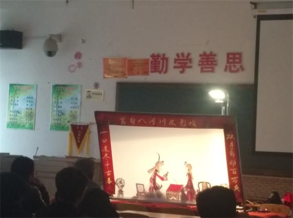 王先生首先介紹了皮影戲的起源、發(fā)展階段和表演特色,然后為師生們現(xiàn)場講解和表演了兩個傳統(tǒng)劇目——《三寶記》、《楊家將》。師生們聚精會神的看著幕布上的精彩場面,嘖嘖稱奇,興趣盎然。演出結(jié)束后,王先生還邀請師生們上臺近距離觀察講解皮影的制作,并耐心傳授皮影戲的表演方法。