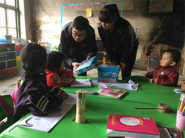 崔承剛部長和扶貧隊一行向村幼兒園小朋友贈送兒童讀物