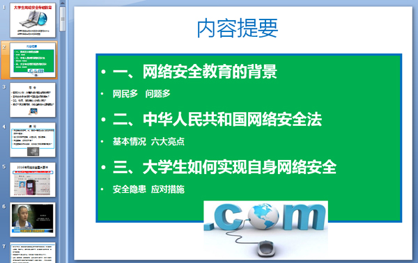 思政部的劉麗果老師從“網(wǎng)絡(luò)安全教育的背景、中華人民共和國(guó)網(wǎng)絡(luò)安全法基本情況及六大特點(diǎn)、大學(xué)生如何實(shí)現(xiàn)自身網(wǎng)絡(luò)安全”等幾個(gè)方面開(kāi)展了6次專題講座,讓學(xué)生對(duì)網(wǎng)絡(luò)安全法有深刻的認(rèn)識(shí),提高了他們自身網(wǎng)絡(luò)安全知識(shí)。