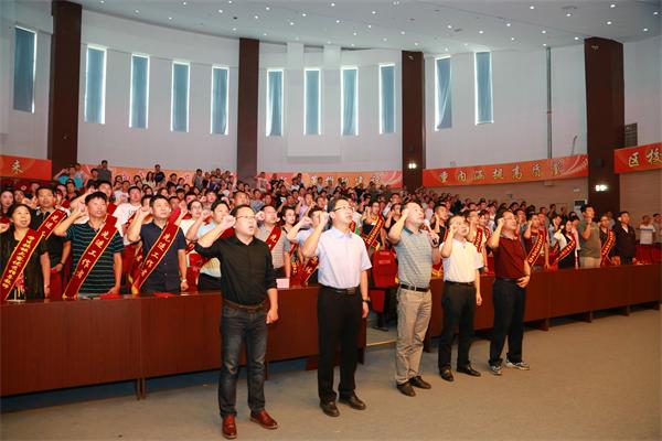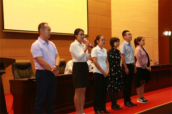 新教師自我介紹之后,他們與全院老教師一道重溫教師誓詞。全院教職工在院黨委副書記陳秋鵬的領(lǐng)誓下莊嚴(yán)宣誓。學(xué)院通過這樣一種具有儀式感的形式,使全校教職工能夠時刻牢記誓言,兢兢業(yè)業(yè)、恪盡職守,從而更加愛校愛生,敬業(yè)奉獻(xiàn)。