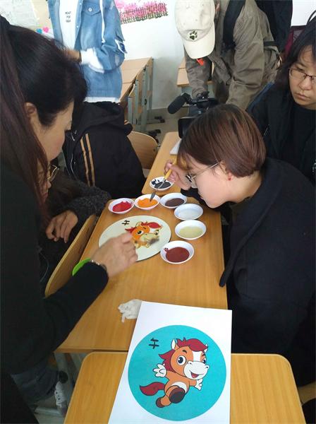 本次活動(dòng)中,劉工程師為在場(chǎng)師生介紹了“掐絲琺瑯”的悠久歷史和景泰藍(lán)珀晶畫的制作原理。這一產(chǎn)品在藝術(shù)表現(xiàn)手法上進(jìn)行改革鼎新,采用FRP材料和雙層不變形木板粘合為胎,耐酸耐腐蝕,金絲鑲嵌,柔美清新。天然釉料充填,光彩奪目,永不褪色。這次活動(dòng)劉工程師還將同學(xué)們分成四組,指導(dǎo)大家完成掐絲和點(diǎn)藍(lán)兩道工序的實(shí)踐,在場(chǎng)師生興趣濃烈,紛紛就制作的工藝中的問(wèn)題和劉工程師進(jìn)行探討。完成的屬相作品生動(dòng)形象,大家都欣喜不已,紛紛合影留念。