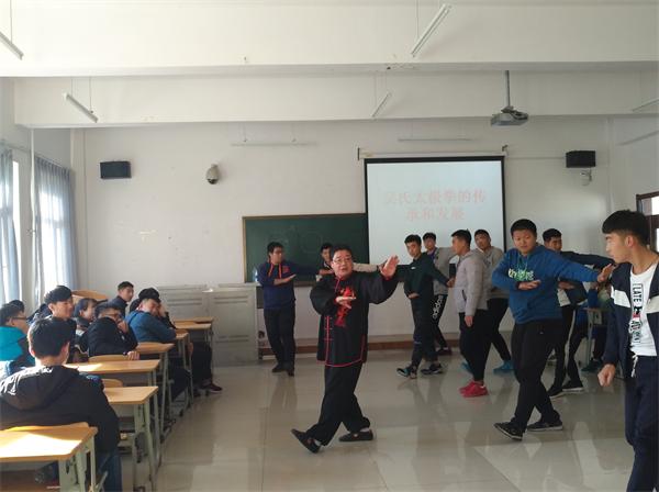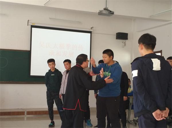 張會(huì)長(zhǎng)從中華太極學(xué)說(shuō)的起源談起,闡釋了太極的哲學(xué)思想和現(xiàn)實(shí)意義。同時(shí)把吳氏太極拳的發(fā)展和特點(diǎn)、套路以及防身自衛(wèi)的方式都進(jìn)行了有針對(duì)性的介紹,同學(xué)們聽(tīng)得津津有味。同時(shí),張社長(zhǎng)還現(xiàn)場(chǎng)為同學(xué)們演示了慢拳和快拳套路,并請(qǐng)同學(xué)們現(xiàn)場(chǎng)體驗(yàn)和學(xué)習(xí)拳式。幾個(gè)學(xué)習(xí)過(guò)太極拳的同學(xué)還不斷向張社長(zhǎng)請(qǐng)教各式各樣的問(wèn)題,張社長(zhǎng)都毫不保留的進(jìn)行指導(dǎo)和講解,整個(gè)現(xiàn)場(chǎng)氣氛十分熱烈、掌聲不斷。