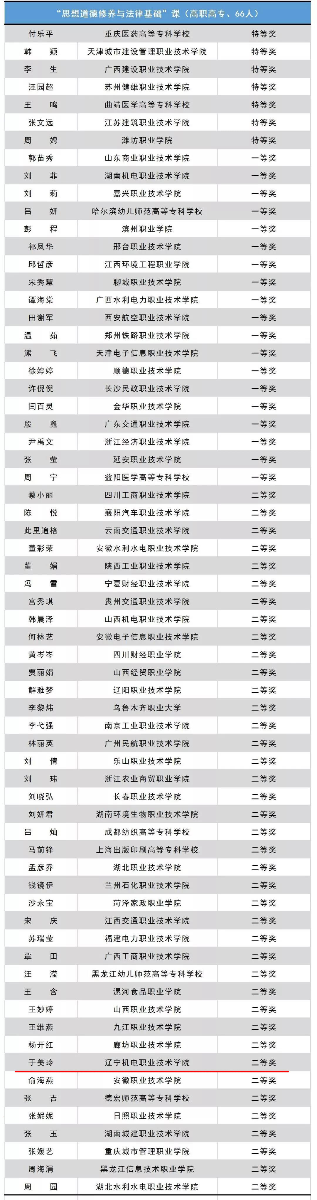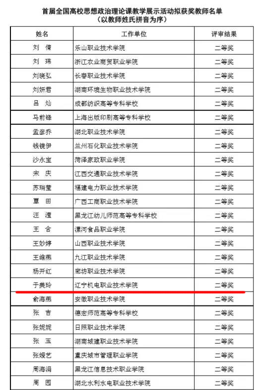 此次教學(xué)展示活動(dòng),是教育部辦公廳為深入學(xué)習(xí)貫徹習(xí)近平總書記在學(xué)校思想政治理論課教師座談會(huì)上的重要講話精神,深入實(shí)施“新時(shí)代高校思想政治理論課創(chuàng)優(yōu)行動(dòng)”的重要舉措。我院思政部于美玲老師在學(xué)院領(lǐng)導(dǎo)的大力支持下,全方位積極備戰(zhàn)。經(jīng)過(guò)遼寧省教育廳、教育部社科司層層嚴(yán)格的選拔,順利入選 “首屆全國(guó)高校思想政治理論課教學(xué)展示活動(dòng)”推薦教師(全國(guó)700名,遼寧26名)。8月教育部組織專家對(duì)入圍教師的教案和教學(xué)視頻進(jìn)行網(wǎng)絡(luò)評(píng)審,于美玲老師主講的《思想道德修養(yǎng)與法律基礎(chǔ)》課程,憑借扎實(shí)的教學(xué)基本功和過(guò)硬的專業(yè)素質(zhì)成功獲得首屆全國(guó)高校思想政治理論課教學(xué)展示活動(dòng)二等獎(jiǎng)。