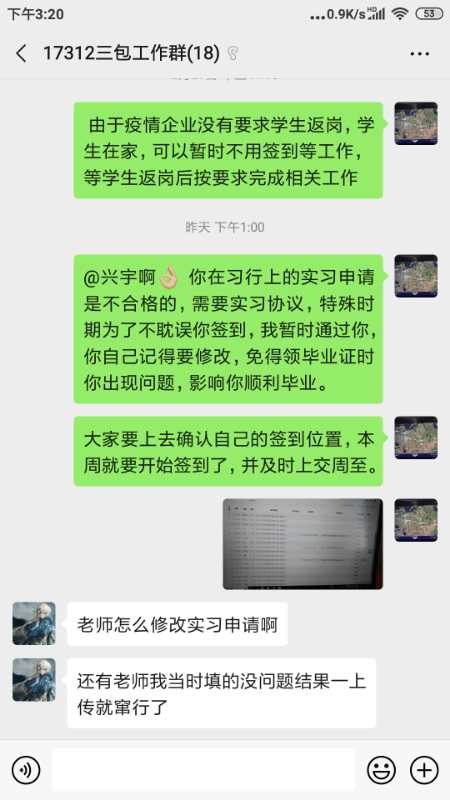 劉文娟老師充分發(fā)揮自己“三包”教師、班導(dǎo)師作用,對2017級機制學(xué)生進行頂崗實習(xí)情況跟蹤,同時安排課程組其余6位“三包”教師加強實習(xí)學(xué)生的常規(guī)管理和預(yù)防教育。充分利用頂崗實習(xí)管理平臺,對學(xué)生進行監(jiān)控,按頂崗實習(xí)要求學(xué)生每周完成簽到與周志等內(nèi)容,鼓勵學(xué)生用良好的專業(yè)技能支持一線生產(chǎn),按照企業(yè)要求積極進行防護和安全生產(chǎn),落實各項防控措施,為戰(zhàn)勝疫情做出自己應(yīng)有的貢獻。并與學(xué)生及家長進行溝通聯(lián)絡(luò),全時全過程掌握學(xué)生動態(tài)。及時利用班級微信群、QQ群等平臺推送國家主流媒體和衛(wèi)生健康部門關(guān)于新型冠狀病毒感染的肺炎疫情防控信息。聯(lián)系、摸排、統(tǒng)計、匯總,這些看似普通的工作卻反映出劉老師的細心、耐心和責(zé)任心。她帶領(lǐng)課程組老師堅定地走在“抗疫”之路上,不留死角、不漏一人。