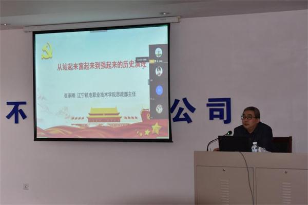 4月22日下午,思政部主任崔承剛為本鋼不銹鋼冷軋丹東公司作了題為《從站起來富起來到強起來的歷史演進》的形勢政策講座。公司黨群工作部部長宋曉軍主持講座會。公司員工200余人分三個會場收看收聽了講座。