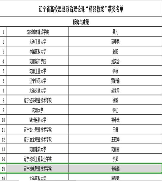 根據(jù)《遼寧省教育廳辦公室關(guān)于開展遼寧省高校思政課“精品教案”評選的通知》,4月30日,遼寧省教育廳公布了全省高校思政課“精品教案”評選結(jié)果,我院思政部教師崔艷璐、葉妍分別在“形勢與政策”和““思想道德修養(yǎng)與法律基礎(chǔ)”課程的評比中獲獎。