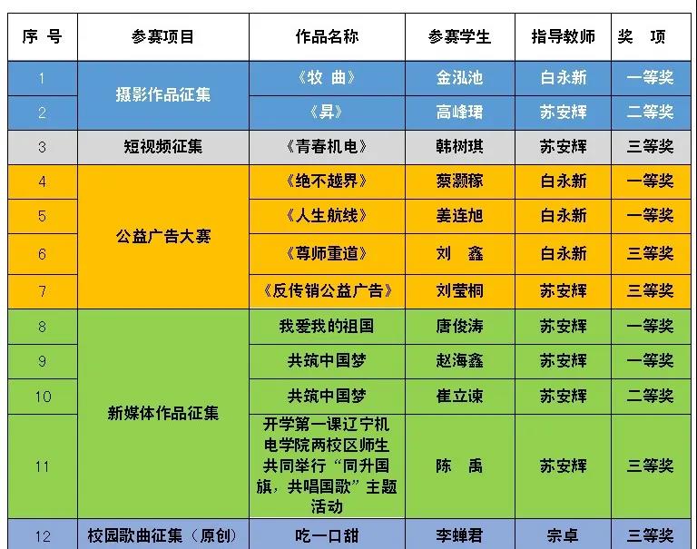 本次遼寧省大學(xué)生網(wǎng)絡(luò)文化節(jié)活動(dòng)包括短視頻作品征集、微電影大賽、攝影大賽、動(dòng)漫作品創(chuàng)作大賽等12項(xiàng)活動(dòng)。自活動(dòng)在校內(nèi)開展以來(lái),各承辦部門高度重視,特別是學(xué)院團(tuán)委和信息工程系,積極組織教師、學(xué)生備賽并按要求申報(bào)作品。歷時(shí)5個(gè)月,在校內(nèi)共征集各項(xiàng)作品210多項(xiàng),推薦到遼寧省大學(xué)生網(wǎng)絡(luò)文化節(jié)作品17項(xiàng),有12項(xiàng)獲獎(jiǎng)。