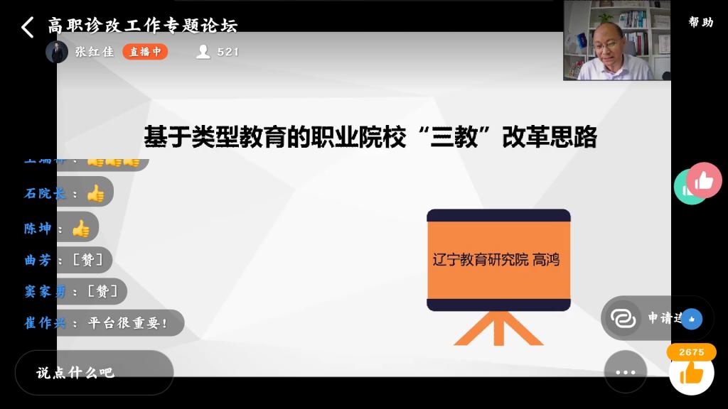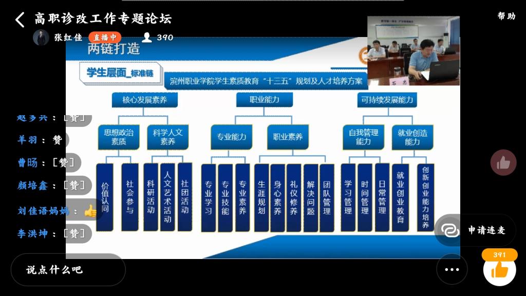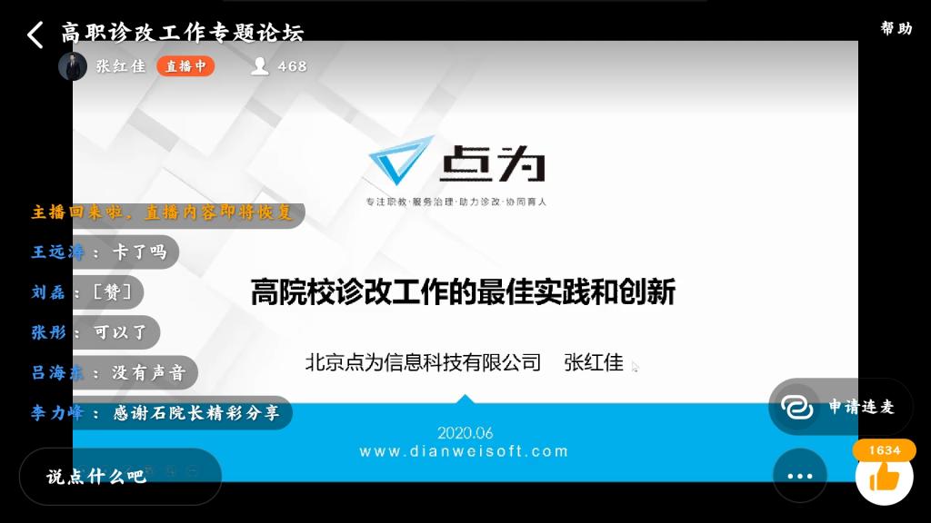 2020年6月20日,教務(wù)處聯(lián)合北京點(diǎn)為信息科技有限公司,組織教學(xué)部門開展診改線上培訓(xùn)。本培訓(xùn)要求教學(xué)部門專業(yè)群主任、課程組長等相關(guān)人員參加,培訓(xùn)主題為“深入推進(jìn)教學(xué)工作診斷改進(jìn),賦能增值現(xiàn)代職業(yè)教育質(zhì)量”,即賦能高職診改工作專題論壇。本論壇是由北京點(diǎn)為信息科技有限公司主辦,論壇邀請了濱州職業(yè)學(xué)院院長、全國職業(yè)院校教學(xué)工作診斷與改進(jìn)專家委員會委員石忠;遼寧省教育科學(xué)研究中心主任、全國職業(yè)院校教學(xué)工作診斷與改進(jìn)專家委員會委員高鴻。石忠院長做了高職院校診改工作趨勢和實(shí)踐分享的主題報(bào)告、高鴻主任做了基于類型教育的職業(yè)院校“三教”改革思路的主題報(bào)告。過程中點(diǎn)為公司工程師張紅佳做了高職院校診改工作的最佳實(shí)踐和創(chuàng)新主題分享。