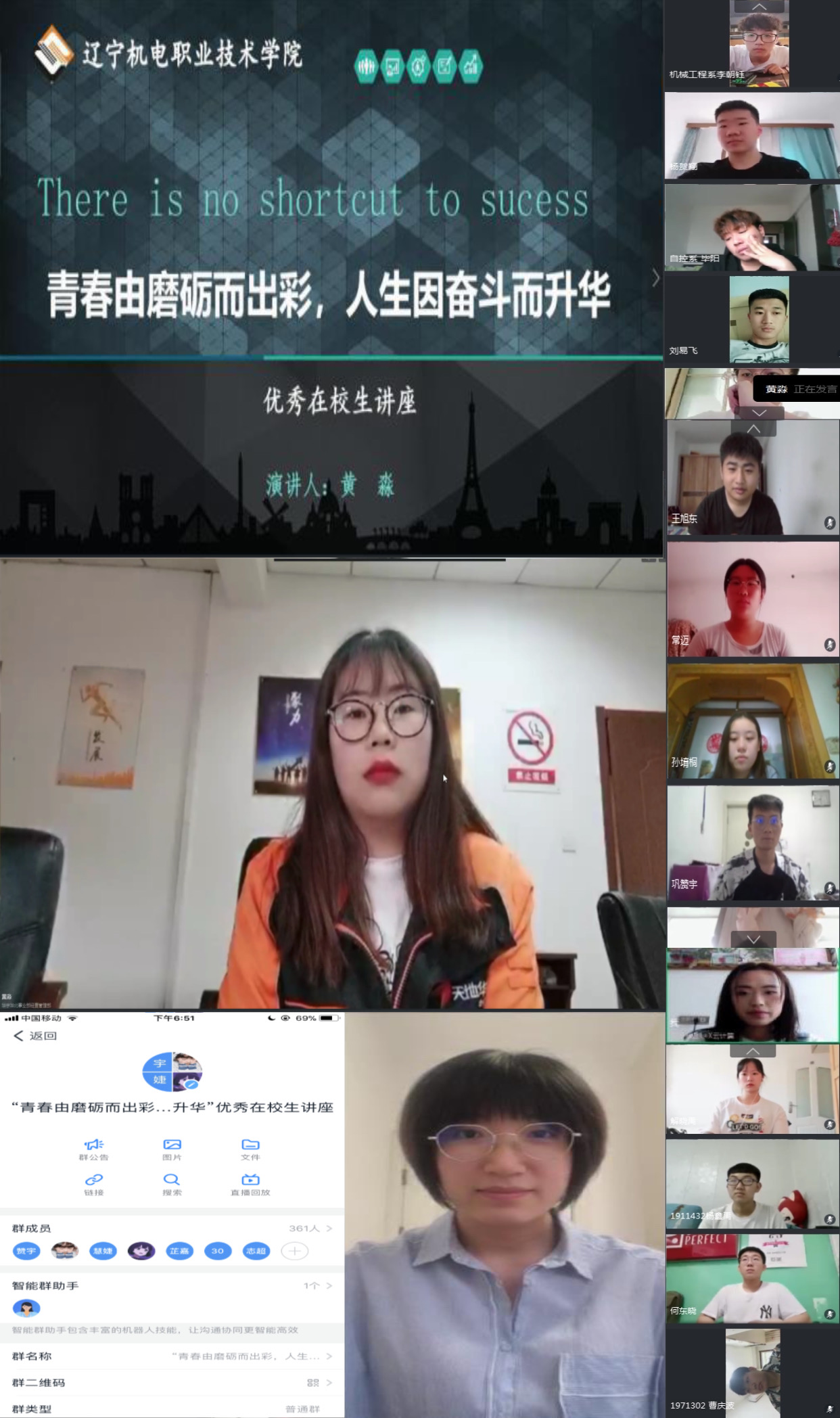“青春由磨礪而出彩,人生因奮斗而升華”。習(xí)近平總書(shū)記在今年五四前夕送給全國(guó)青年的寄語(yǔ)揭示了青春的的意義和人生的價(jià)值。為選樹(shù)典型、學(xué)習(xí)先進(jìn)、推廣經(jīng)驗(yàn),充分發(fā)揮大學(xué)生先進(jìn)典型的示范帶動(dòng)作用,引導(dǎo)同學(xué)們樹(shù)立遠(yuǎn)大的理想目標(biāo),培養(yǎng)堅(jiān)韌不拔,不懈奮斗的精神品質(zhì),7月3日18:30,院團(tuán)委特舉辦“青春由磨礪而出彩,人生因奮斗而升華”優(yōu)秀在校生線上講座。活動(dòng)邀請(qǐng)到我院第十七屆團(tuán)委學(xué)生副書(shū)記黃淼同學(xué)為大家分享奮斗成長(zhǎng)經(jīng)驗(yàn)。我院近400名學(xué)生通過(guò)釘釘平臺(tái)參加了此次講座,活動(dòng)由團(tuán)委宗卓老師主持。