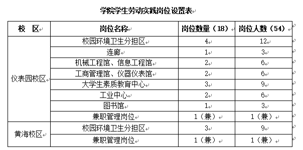 學(xué)院“學(xué)生勞動(dòng)教育實(shí)踐崗”的設(shè)置,是根據(jù)儀表園校區(qū)和黃海校區(qū)實(shí)際情況而定,分為18個(gè)崗位,每崗3人。實(shí)踐崗位報(bào)名在個(gè)人申請(qǐng)、院系推薦、民主集中的原則上,共有241名同學(xué)脫穎而出,最終選出54名誠(chéng)實(shí)守信、品學(xué)兼優(yōu)、積極上進(jìn)的同學(xué)作為勞動(dòng)實(shí)踐崗人員。