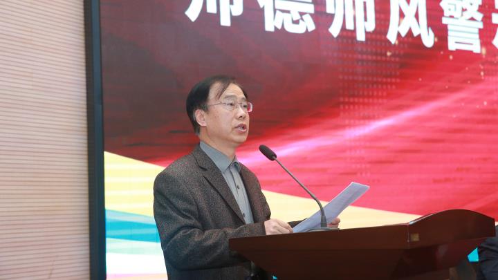 于宏國就進一步做好學校師德師風建設提出三點意見。他指出,一要提高政治站位,轉變思想認識。全體教師要內強素質、外樹形象,把能力提升與作風建設相結合,做到課堂講授有紀律,學術研究有原則,公開言論有底線,營造風清氣正的校園政治生態(tài)環(huán)境。二要健全體制機制,強化制度保障。要堵牢制度建設漏洞;要健全事前監(jiān)管機制,提前摸排研判,處理潛在“苗頭”,做到“防患于未然”,筑牢師德師風建設“防火墻”。三要以案為鑒,樹立底線意識。各總支、各支部、各部門黨政負責人作為師德建設第一責任人,嚴格落實師德建設主體責任,認真做好專項整治有關工作。要以本次師德警示教育活動為契機,發(fā)揮師德失范問題典型案例警示、觸動作用,喚起廣大教師規(guī)則意識、底線意識,引導教職員工時刻自重、自省、自警、自勵,把教師職業(yè)責任時刻放在心上。