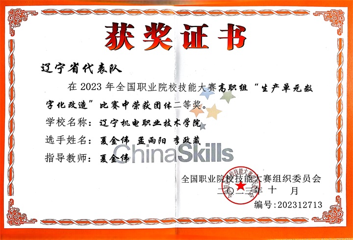 近日,2023年全國職業(yè)院校技能大賽高職組“生產單元數字化改造”賽項在天津輕工職業(yè)技術學院舉行。由我校自控系工業(yè)機器人技術專業(yè)教師夏金偉,學生孟雨陽、李政葳三人組成的遼寧省一隊榮獲團體二等獎。