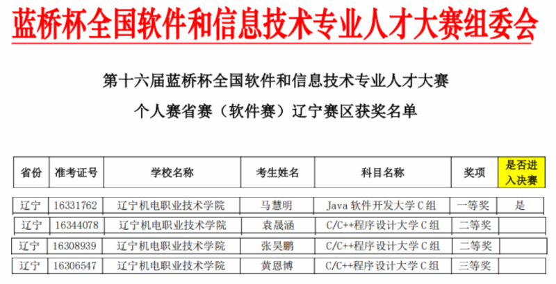 4月12日,第十六屆藍(lán)橋杯全國(guó)軟件和信息技術(shù)專業(yè)人才大賽省賽在全國(guó)各考點(diǎn)開賽,本屆大賽共設(shè)置線下賽點(diǎn)746個(gè),我校學(xué)生在遼東學(xué)院考點(diǎn)同步參加遼寧賽區(qū)線上軟件賽項(xiàng)的比賽。4月30日,經(jīng)組委會(huì)公布成績(jī),學(xué)校軟件技術(shù)專業(yè)學(xué)生馬慧明在教師馬秀麗的指導(dǎo)下榮獲“JAVA軟件開發(fā)大學(xué)C組”一等獎(jiǎng),并取得晉級(jí)參加國(guó)賽資格;物聯(lián)網(wǎng)應(yīng)用技術(shù)專業(yè)學(xué)生袁晟涵、軟件技術(shù)專業(yè)學(xué)生張昊鵬在教師馬秀麗、楊靈的指導(dǎo)下榮獲“C/C++程序設(shè)計(jì)大學(xué)C組”二等獎(jiǎng);軟件技術(shù)專業(yè)學(xué)生黃恩博在教師翟鵬翔的指導(dǎo)下榮獲“C/C++程序設(shè)計(jì)大學(xué)C組”三等獎(jiǎng)。