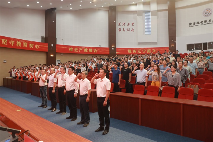人力資源處(教師發(fā)展中心)處長(zhǎng)賈濤領(lǐng)誓《人民教師誓詞》,全體教職員工舉起右拳,莊嚴(yán)宣誓,重溫誓詞。