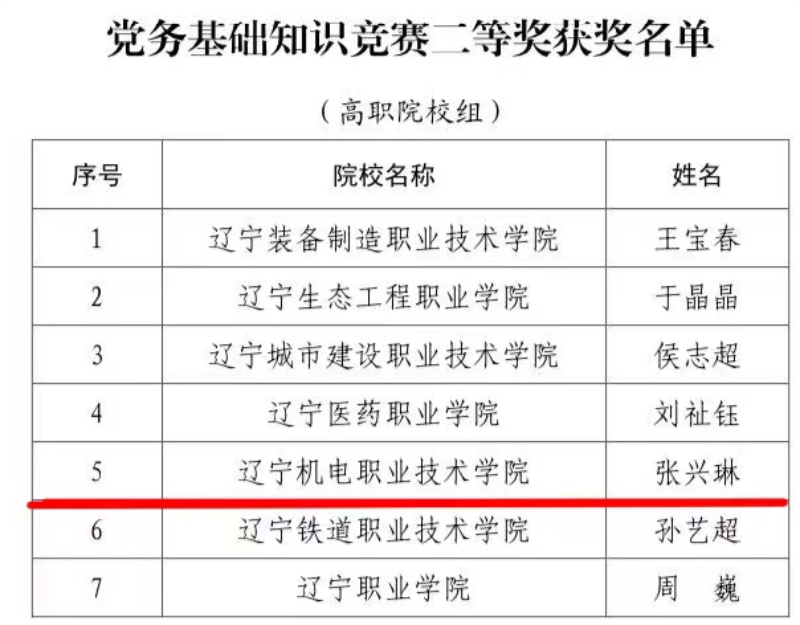10月15日至17日,第二屆遼寧省高校組織員素質(zhì)能力大賽在大連海事大學成功舉辦。我校由組織部副部長劉作朋擔任領隊,帶領張興琳、王昊、楚卉佳三名組織員組隊參賽,經(jīng)過激勵角逐,最終我院代表隊榮獲高職院校組集體三等獎。張興琳同志在主題微黨課展示和黨務基礎知識競賽兩個環(huán)節(jié)中分獲個人一等獎、二等獎。