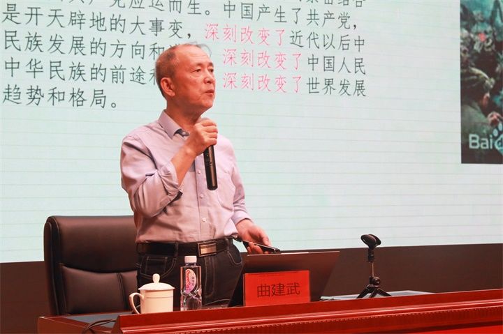 曲建武教授以“涵養(yǎng)崇高師德 傾力鑄魂育人”為題,結合自己四十二載思政育人工作經(jīng)驗,從“傳播大學文化之責、增強政治意識之德、懷有知恩圖報之德”三個角度深情詮釋了高校教師“涵養(yǎng)崇高師德”的初心使命;從“堅定理想信念、工作腳踏實地、激勵學生為祖國學習、關心學生生活”四個方面深刻闡述了“傾力鑄魂育人”的思想深度。曲建武教授通過一條條與學生交流的信息、一張張與學生相處的照片、一次次陪伴引導學生的成長經(jīng)歷、一個個幫扶學生的生動故事……既結合時代背景,又融入工作思考,為我校教職工帶來了一堂精彩生動、觸及靈魂的思政大課。