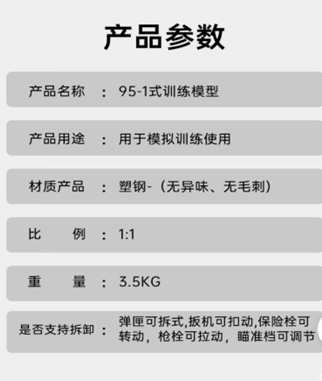 95式自動步槍訓練模擬槍 | 比例1:1、黑色、重量3.5公斤 | 300 | 50支 | 15000 |