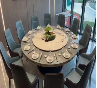 3 | 圓餐桌3 | ★餐桌尺寸:直徑3000mm*高720mm;轉(zhuǎn)盤尺寸直徑1500mm;桌面材質(zhì):直徑3000mm巖板壓鐵鍍金邊,中間轉(zhuǎn)盤巖板壓鐵鍍金邊以及底圈,桌芯轉(zhuǎn)盤鑲嵌3個(gè)功率2500w隱形電磁爐,巖板厚度120mm;底座尺寸:壁厚1.0鐵制桶形底座,尺寸直徑1500mm不銹鋼包邊以及底圈,內(nèi)部鋼架結(jié)構(gòu),優(yōu)質(zhì)電機(jī),電動(dòng)轉(zhuǎn)盤,遙控控制。 |