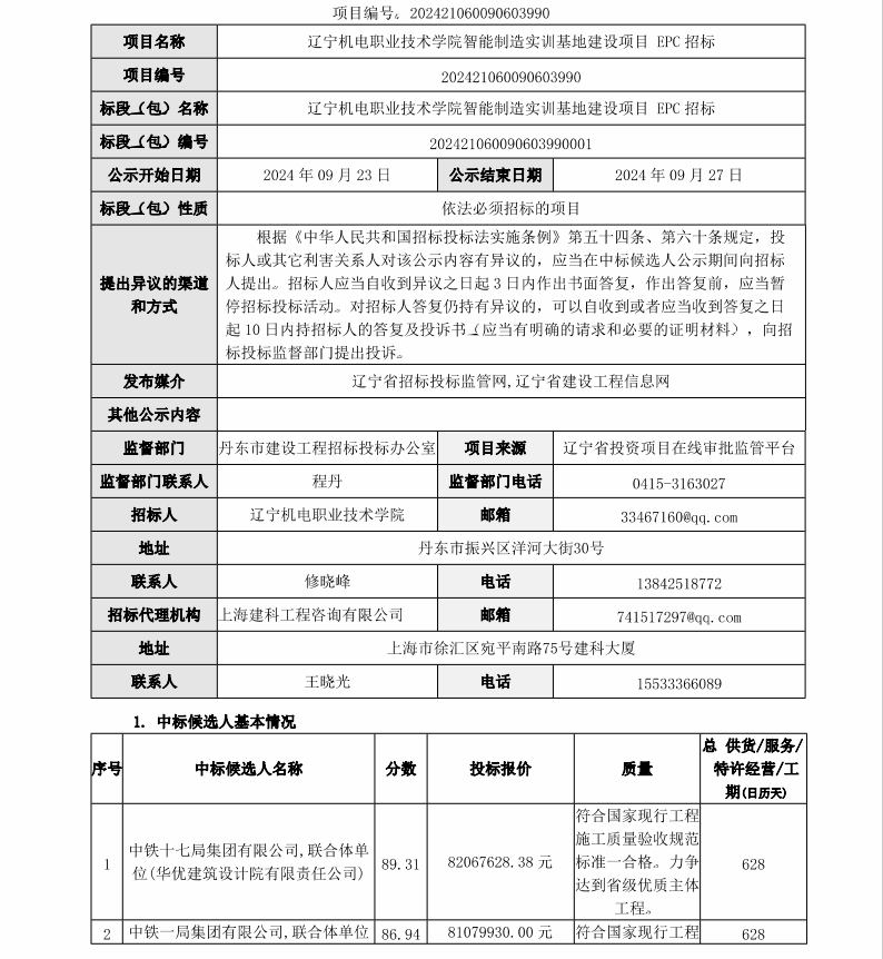 遼寧機(jī)電職業(yè)技術(shù)學(xué)院智能制造實訓(xùn)基地建設(shè)項目EPC招標(biāo)中標(biāo)候選人公示